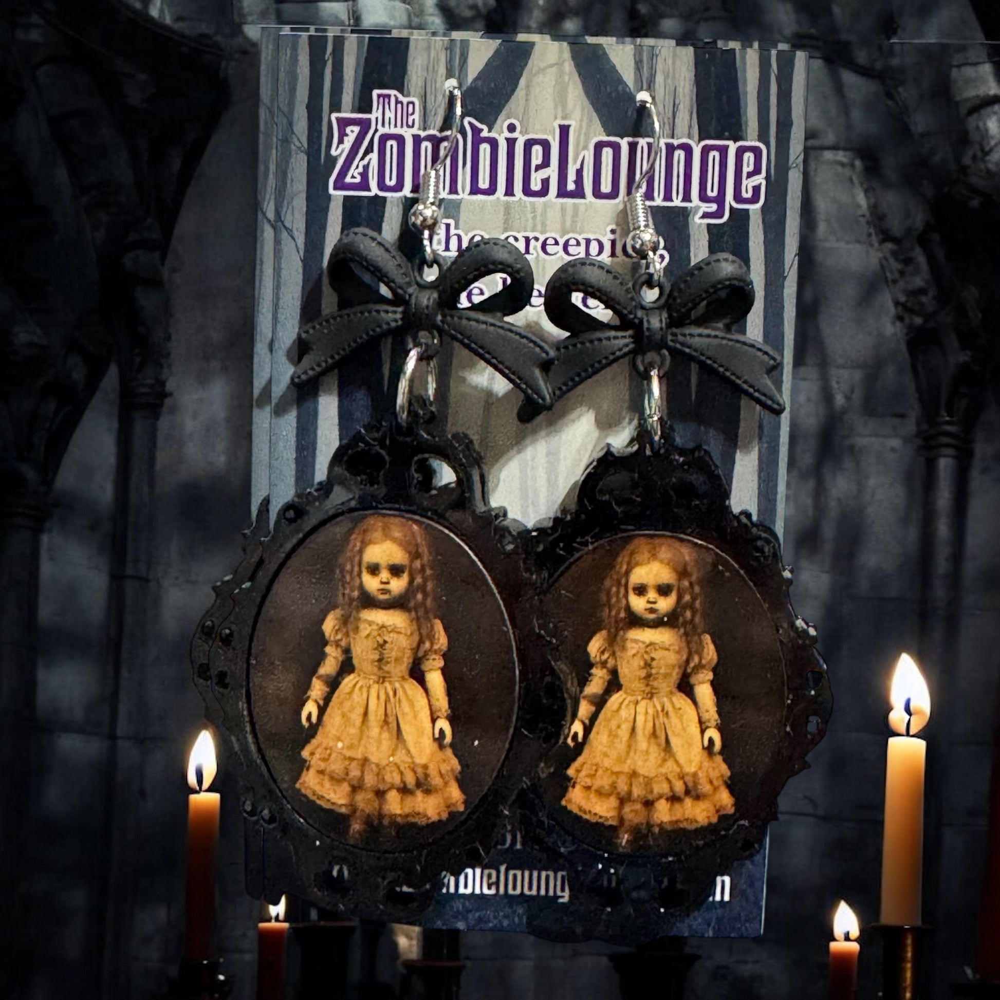 Antique style frame earrings with creepy dolls. Choose from standing or face style.