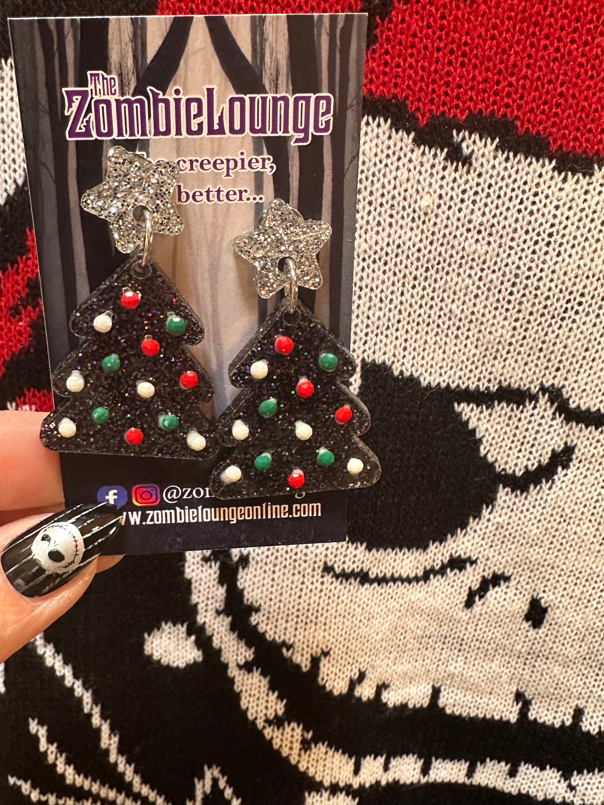 Getting ready for Creepmas!! New gothic black tree hanging earrings! Choose from red star or silver star studs.