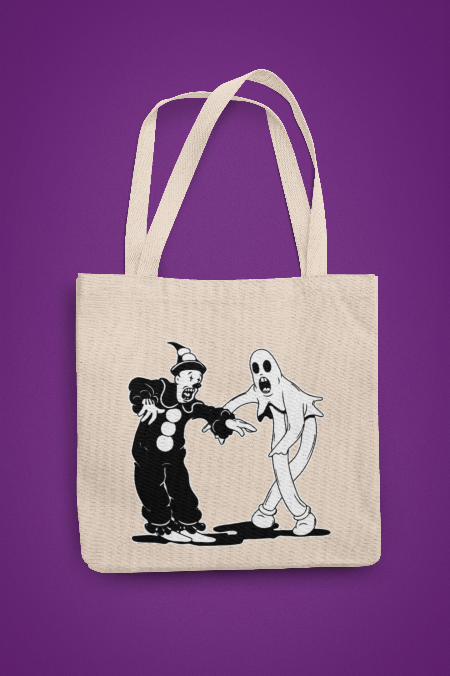 Dancing Koko the Clown and ghost tote bag. Choose from beige or black.