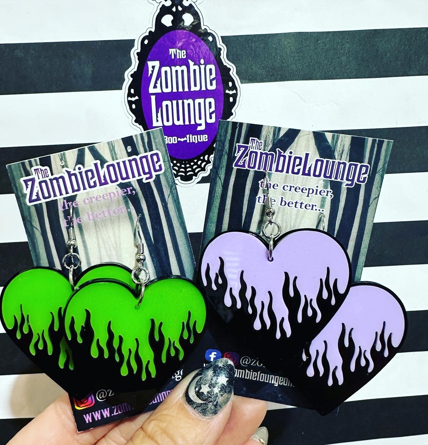 Acrylic flaming heart hanging stud earrings. Choose from green or purple
