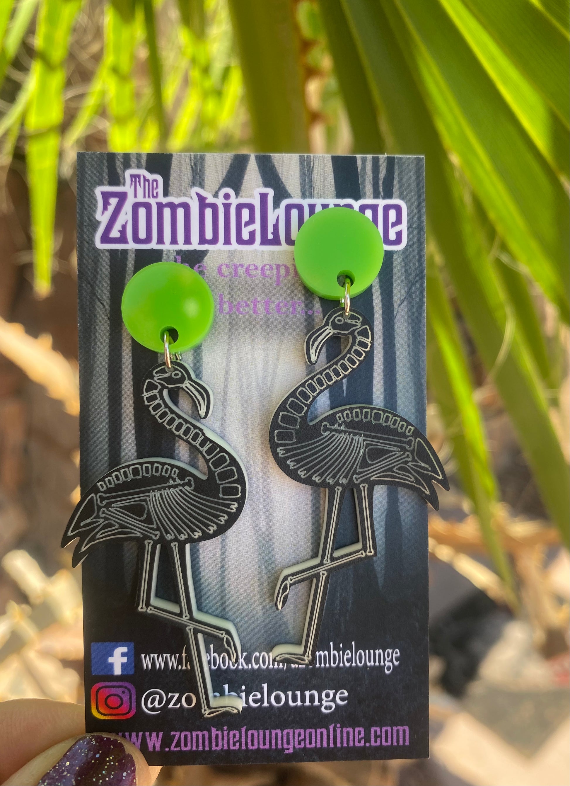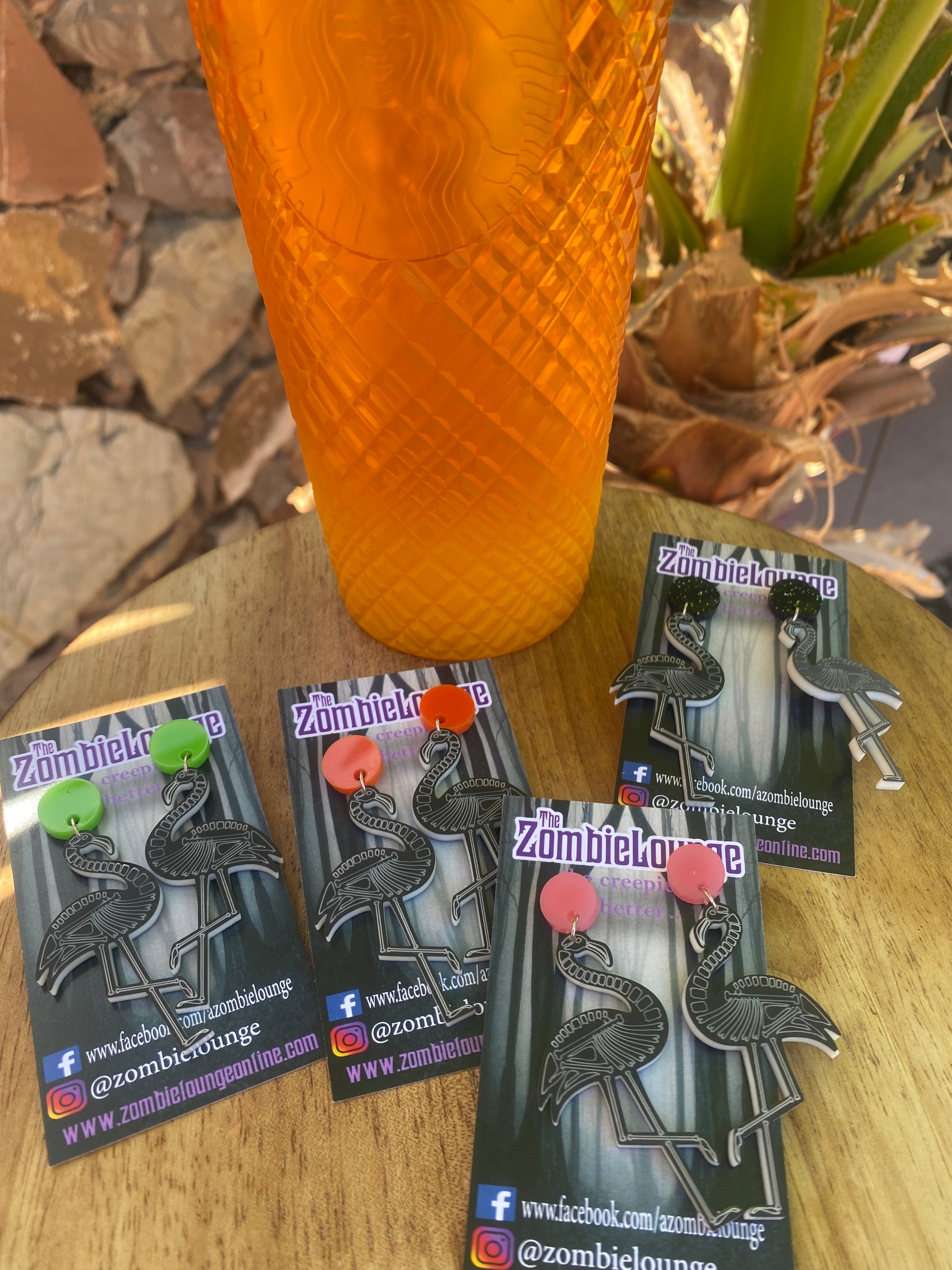 Flamingo skeleton earrings. Hanging earring with a stud post.