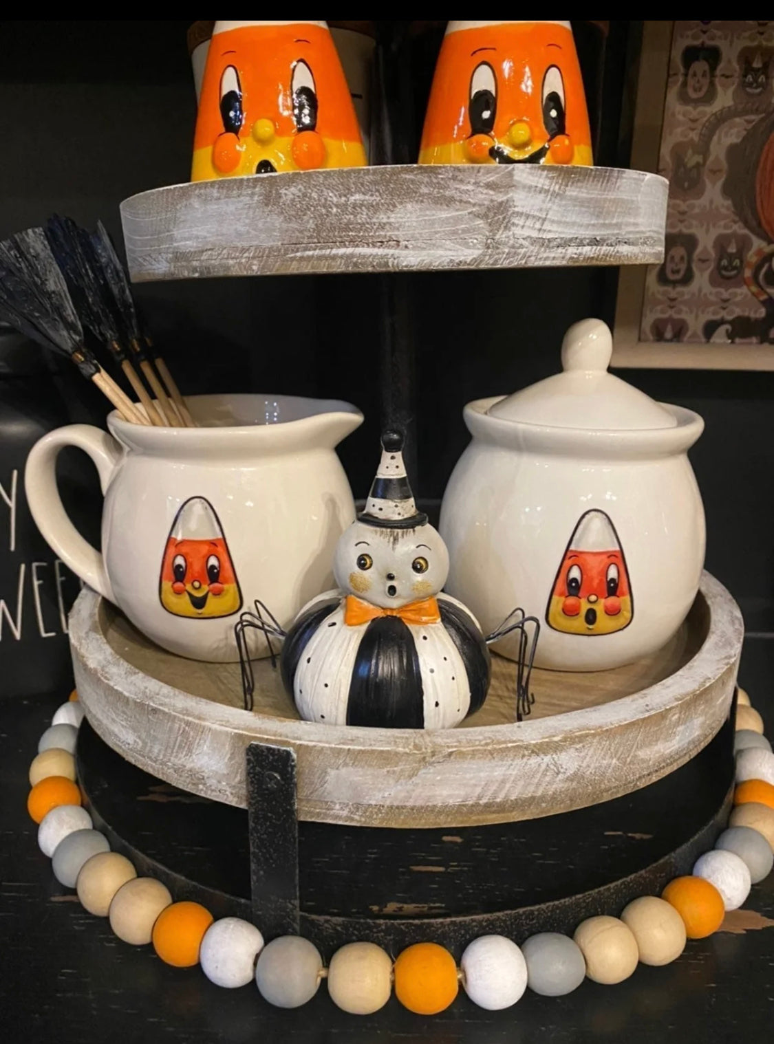 Set of Halloween vinyl decals. Made with for JPD Partners in Crafts. These are printed on clear vinyl perfect for light colored items. Add them to the backs of your dishes, mugs, tea pots, pitchers, canisters, ceramics, etc. for vintage Halloween style decor! Pairs perfectly with tiered trays, coffee bars, Rae Dunn, Johanna Parker Designs, Bethany Lowe Designs, and farmhouse style Halloween decorations.