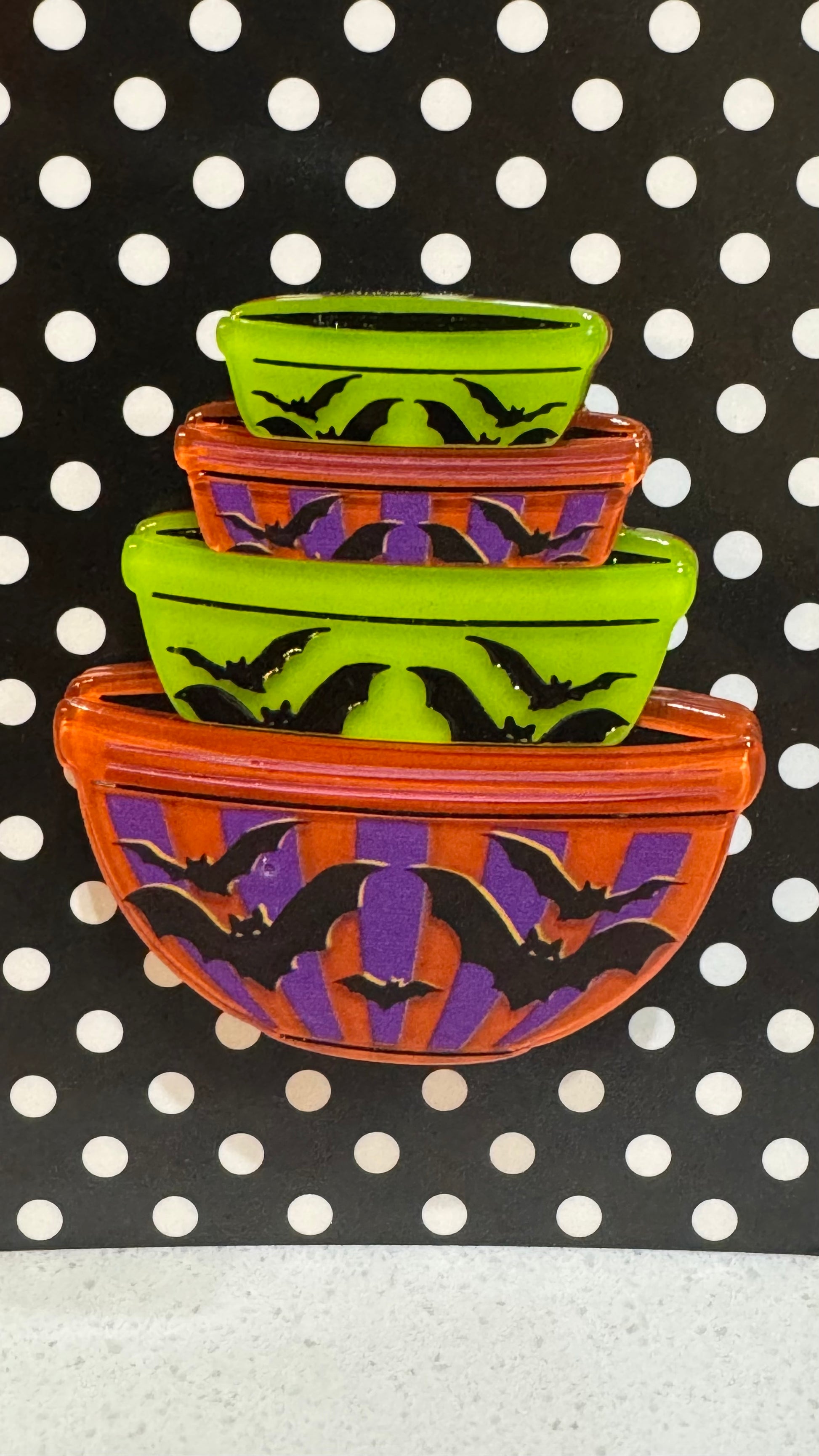 Channel your inner witch with the Menacing Mixers Pyrex Halloween Inspired Bowl Brooch by Lipstick and Chrome! This vintage-inspired brooch is crafted from laser-cut acrylic and features a playful design reminiscent of classic Pyrex mixing bowls.
