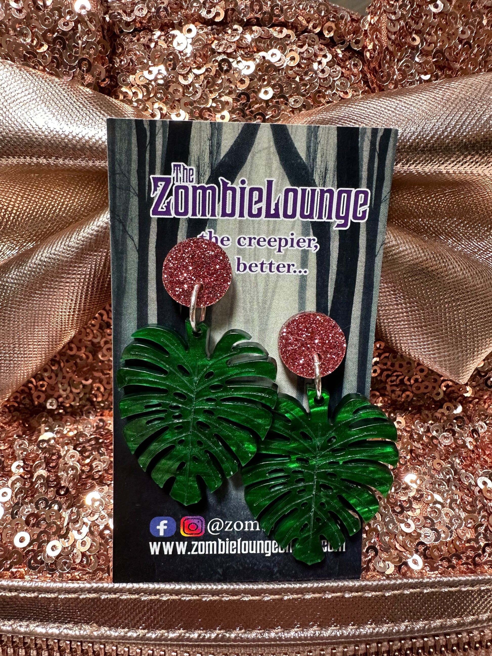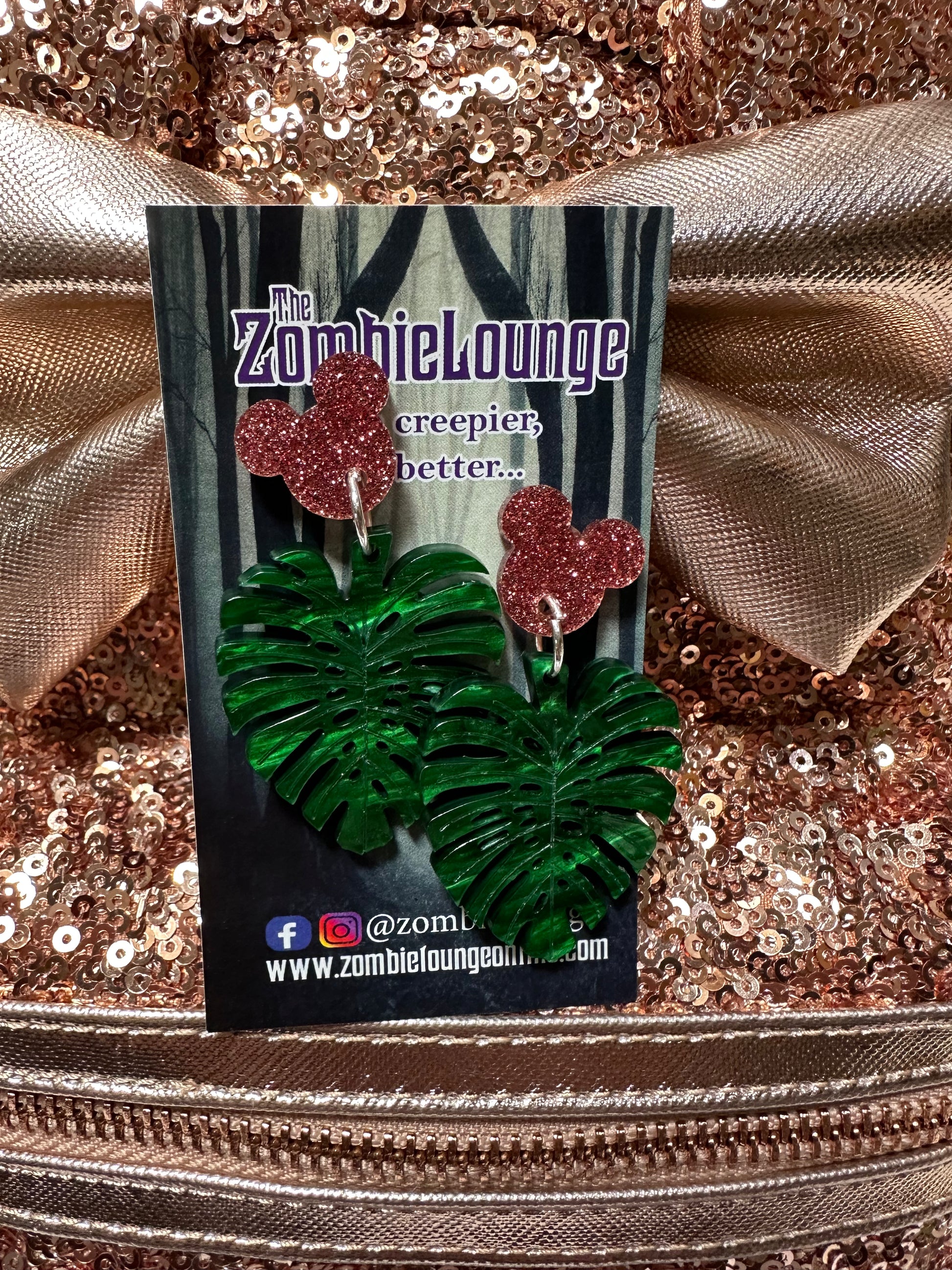 New monstera leaf acrylic hanging earrings. Choose from rose gold glitter studs or glitter mouse studs.