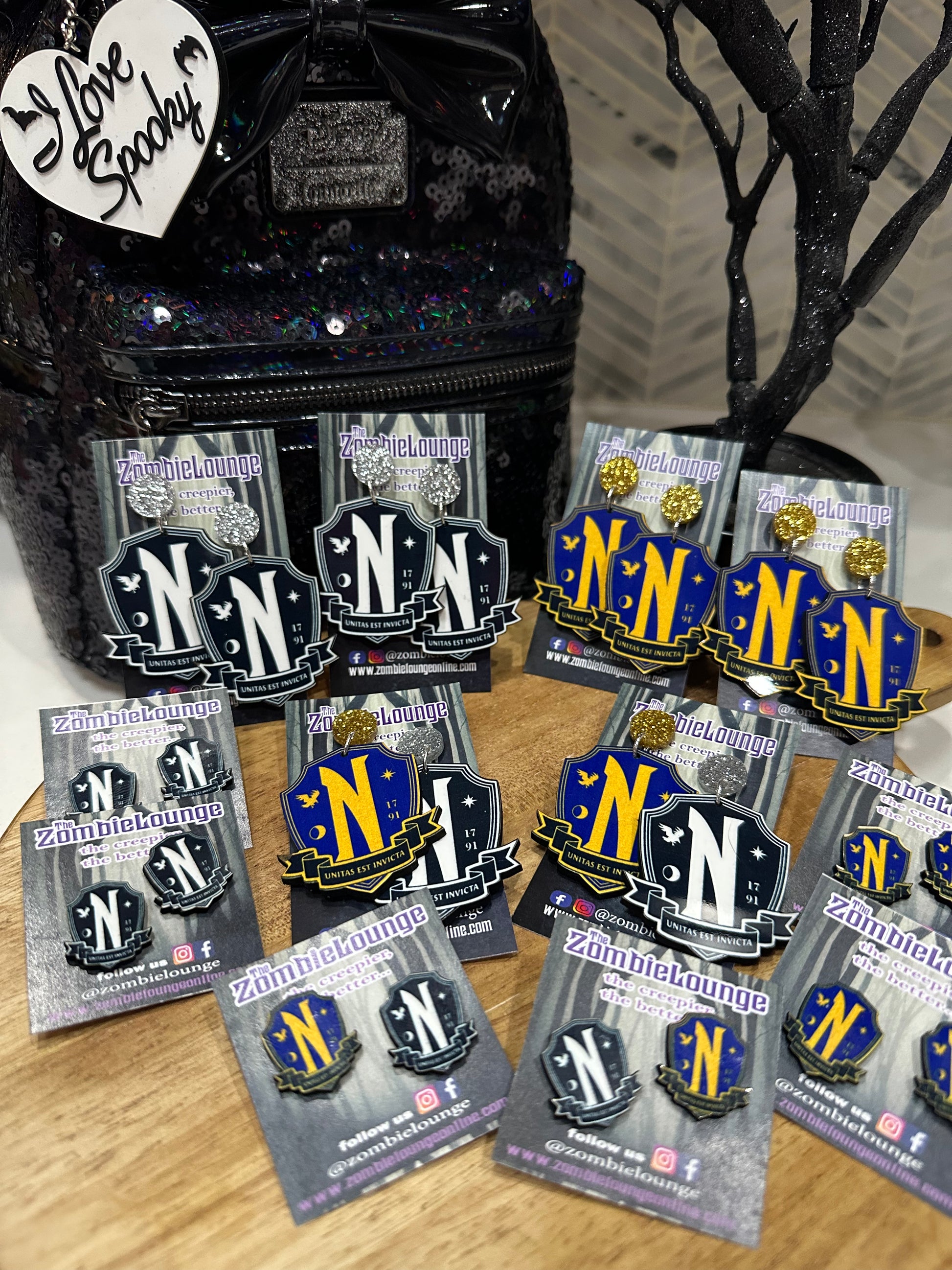 Nevermore Academy wooden earrings. Choose from color, black and white, or multi hanging or studs.