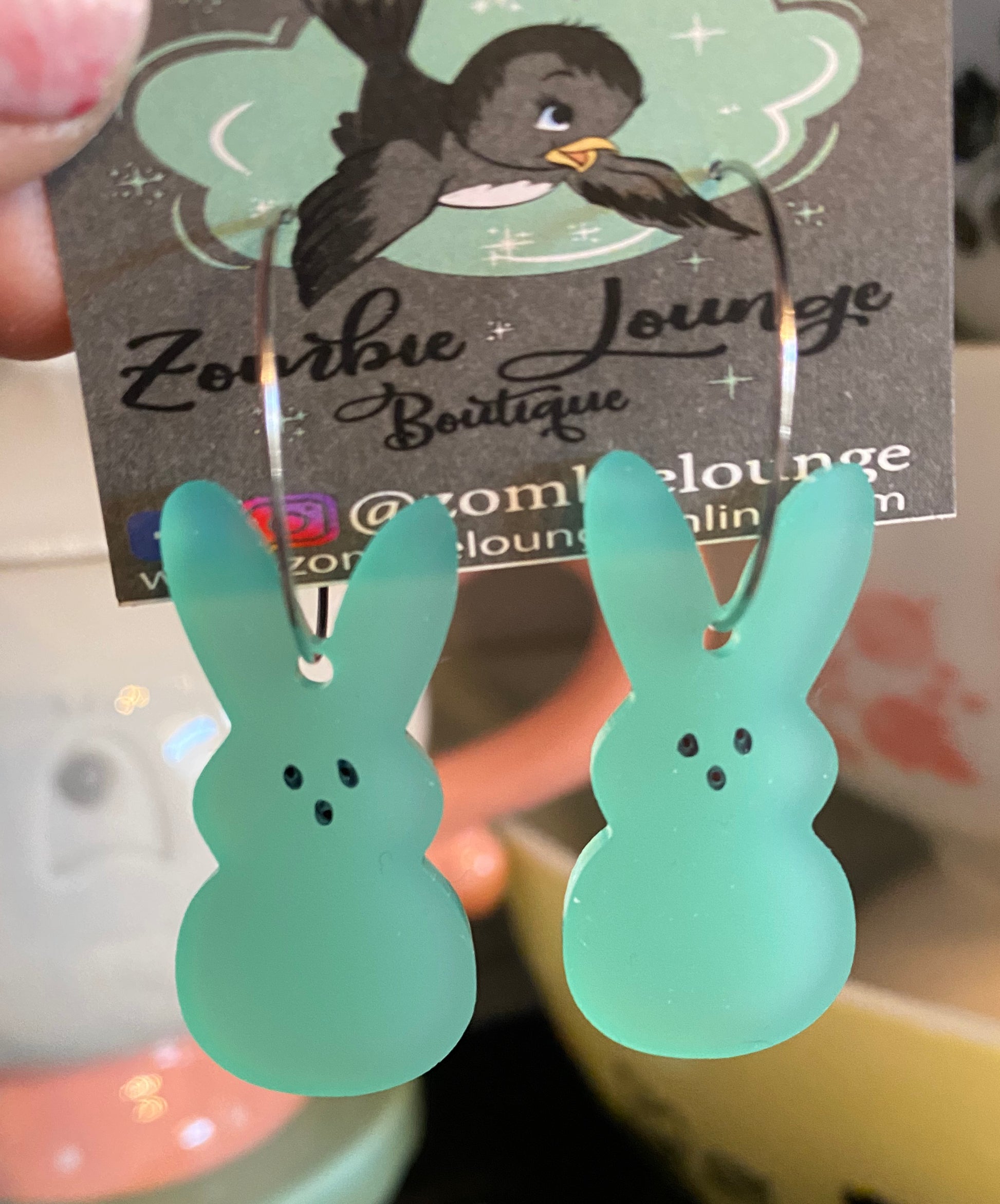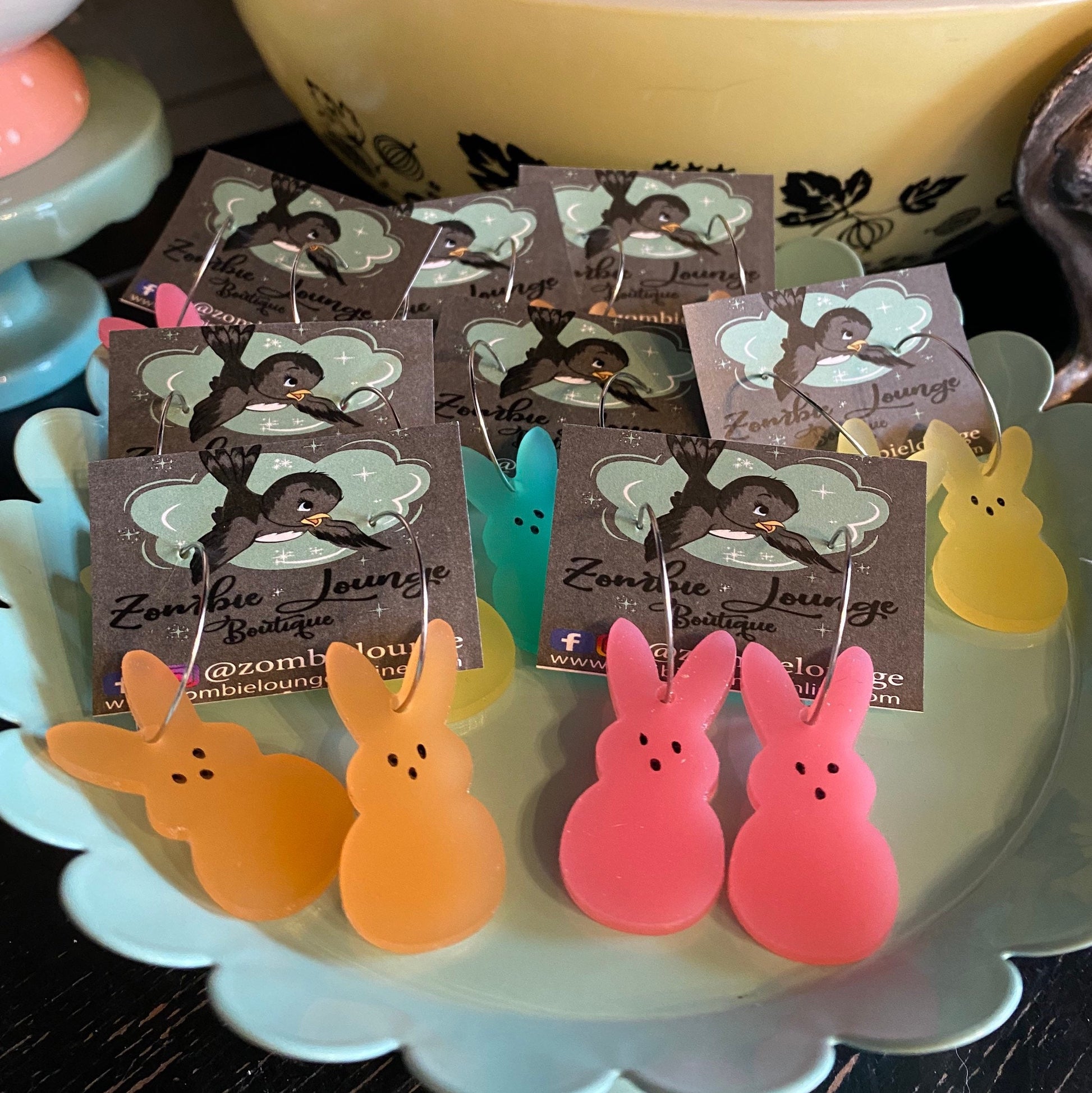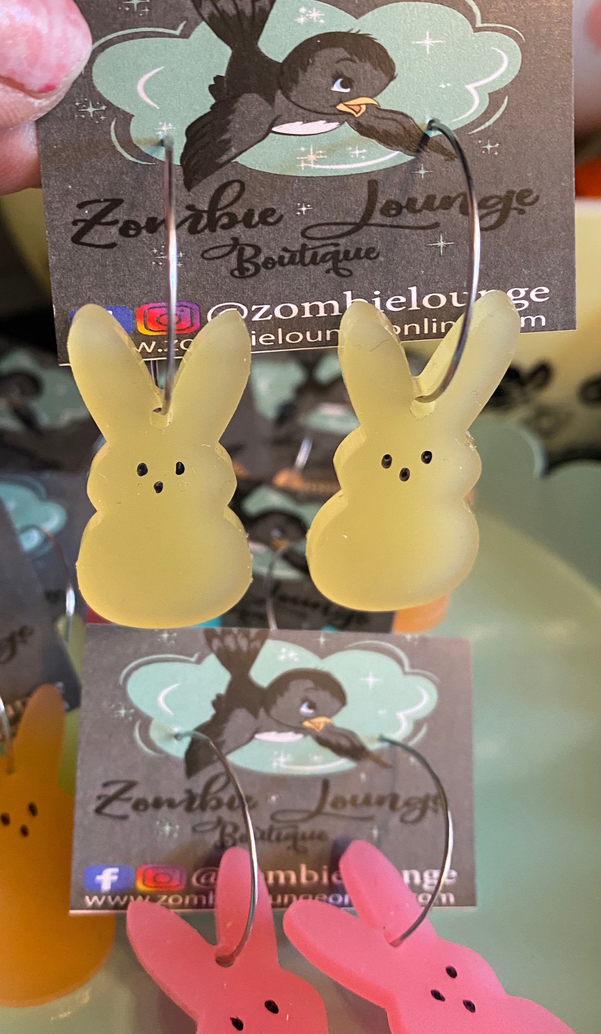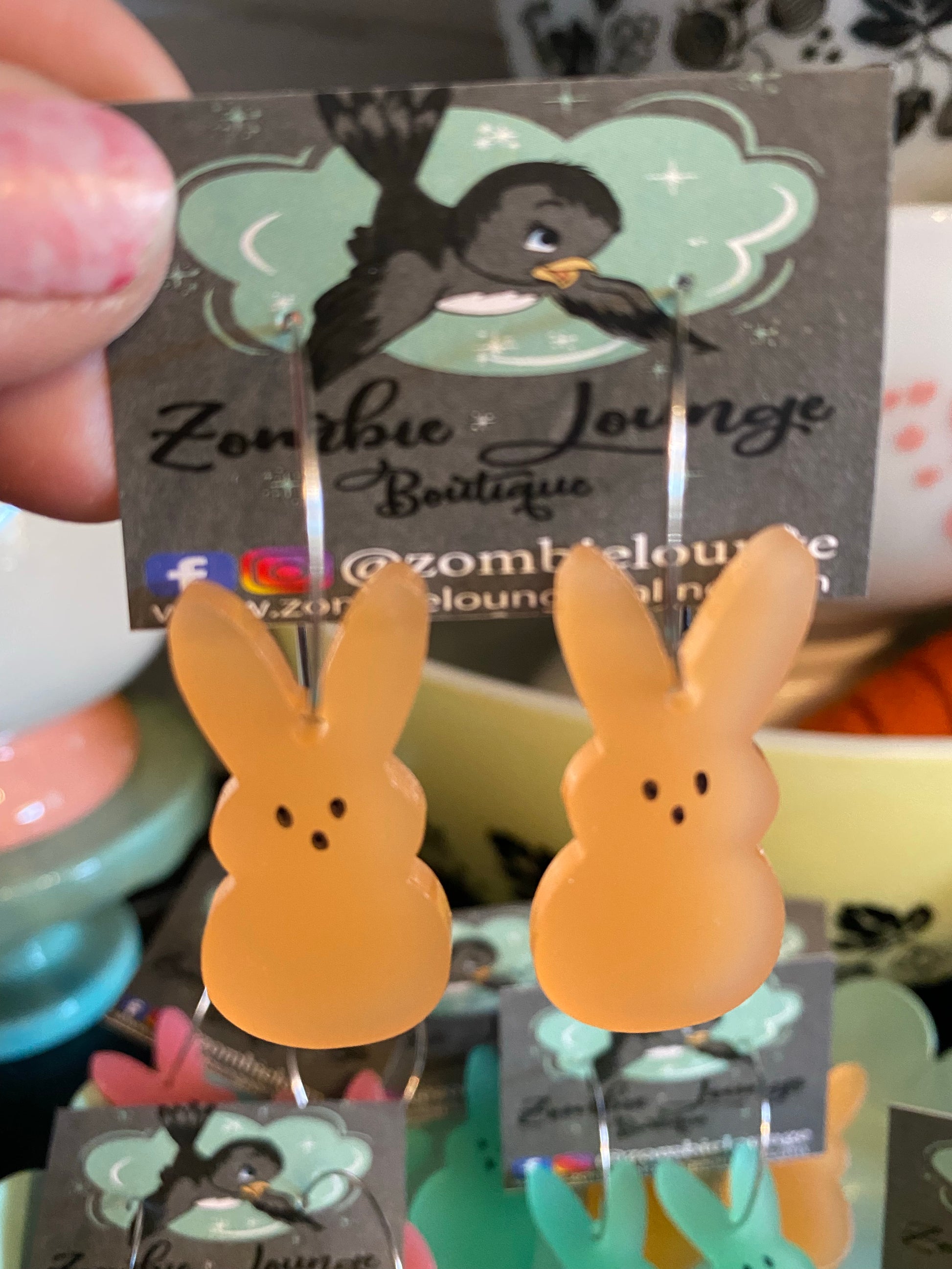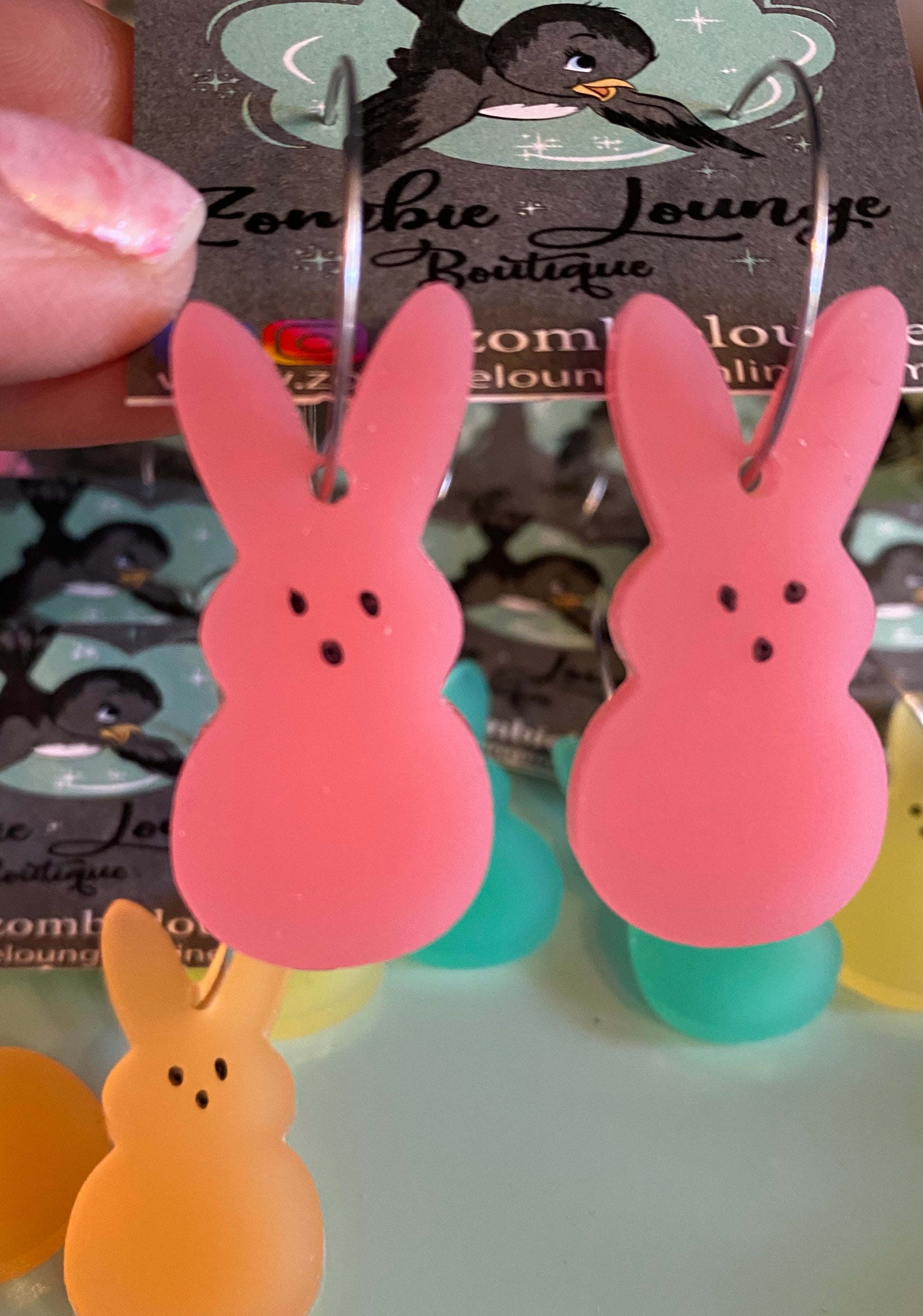 Laser cut frosted acrylic sleeps bunny hanging earrings. Perfect for Spring and Easter