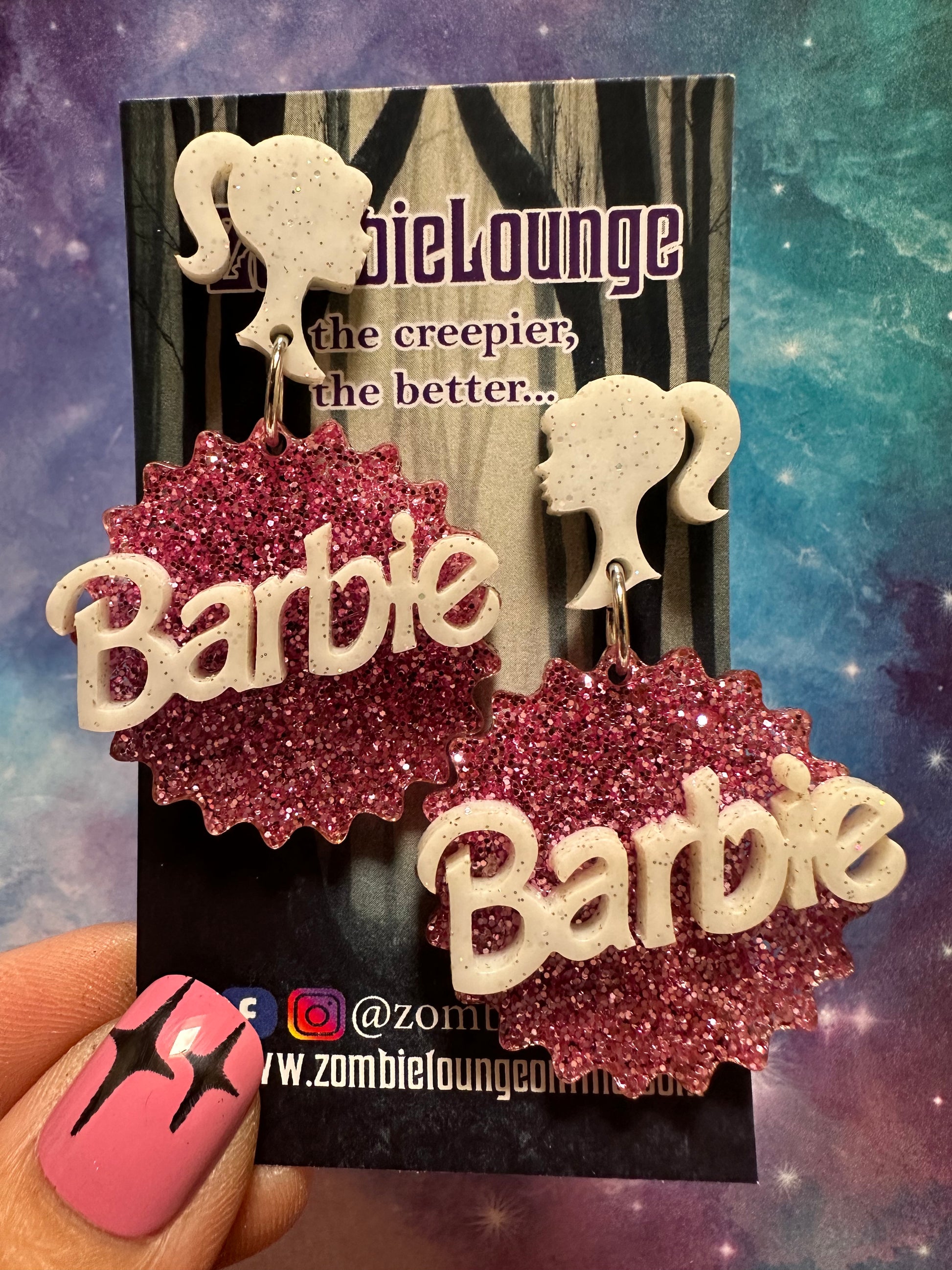 Super cute acrylic hanging plastic doll pink glitter logo earrings.
