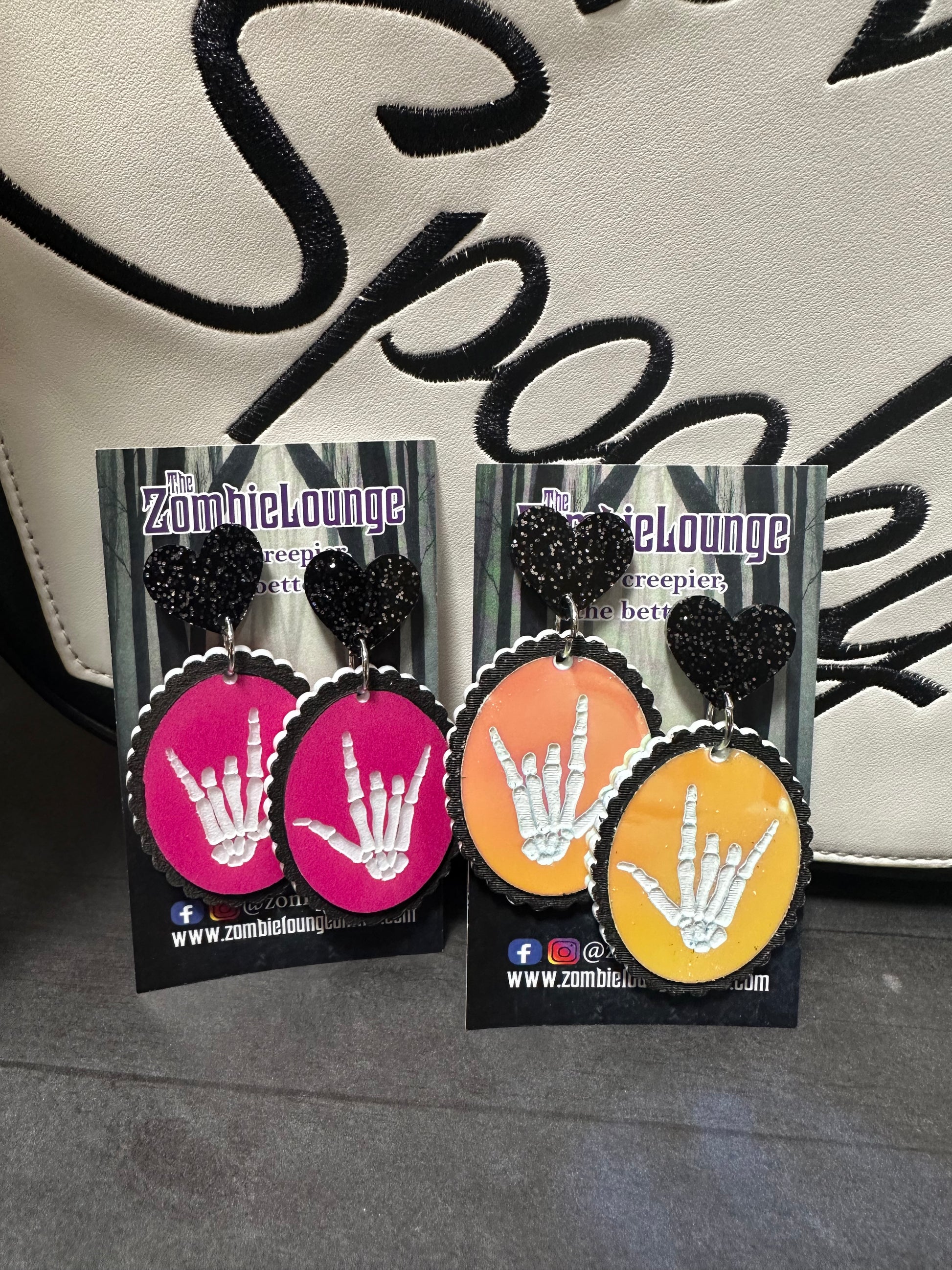Tell someone “I love you” with our creepy valentines skeleton hands earrings! Perfect for Valloween! Choose from iridescent pink or hot pink!