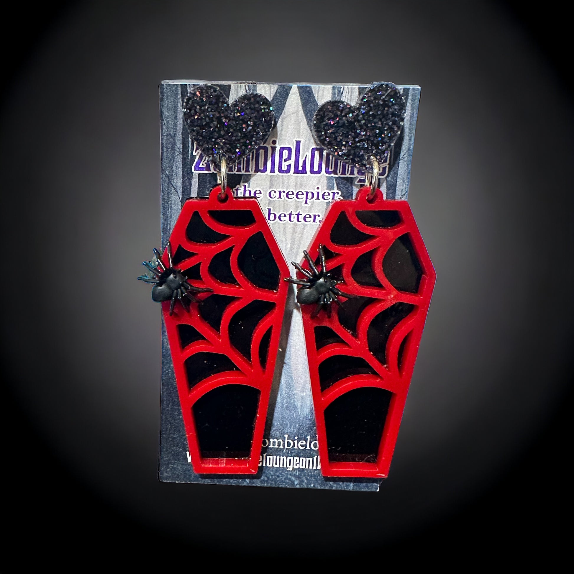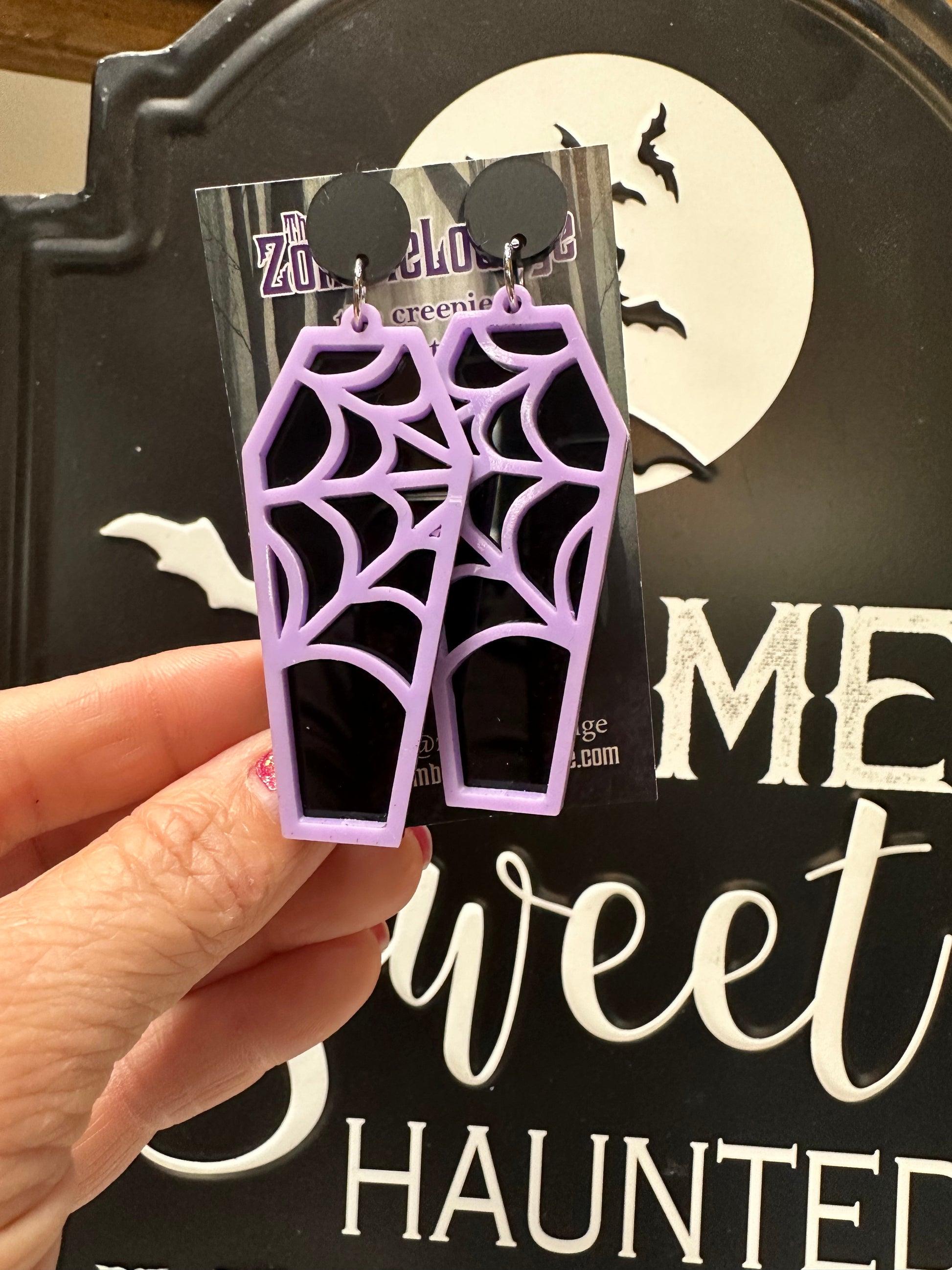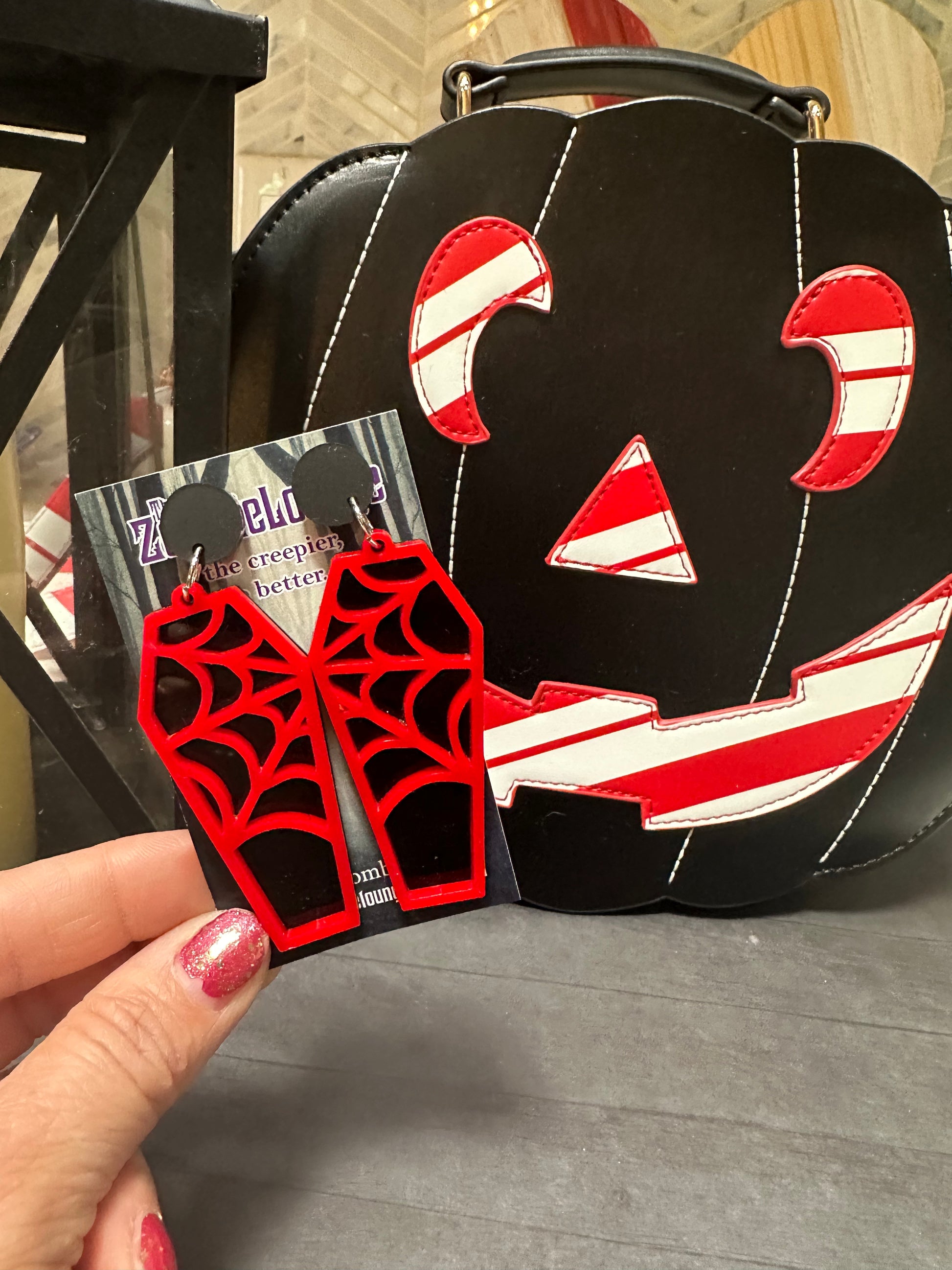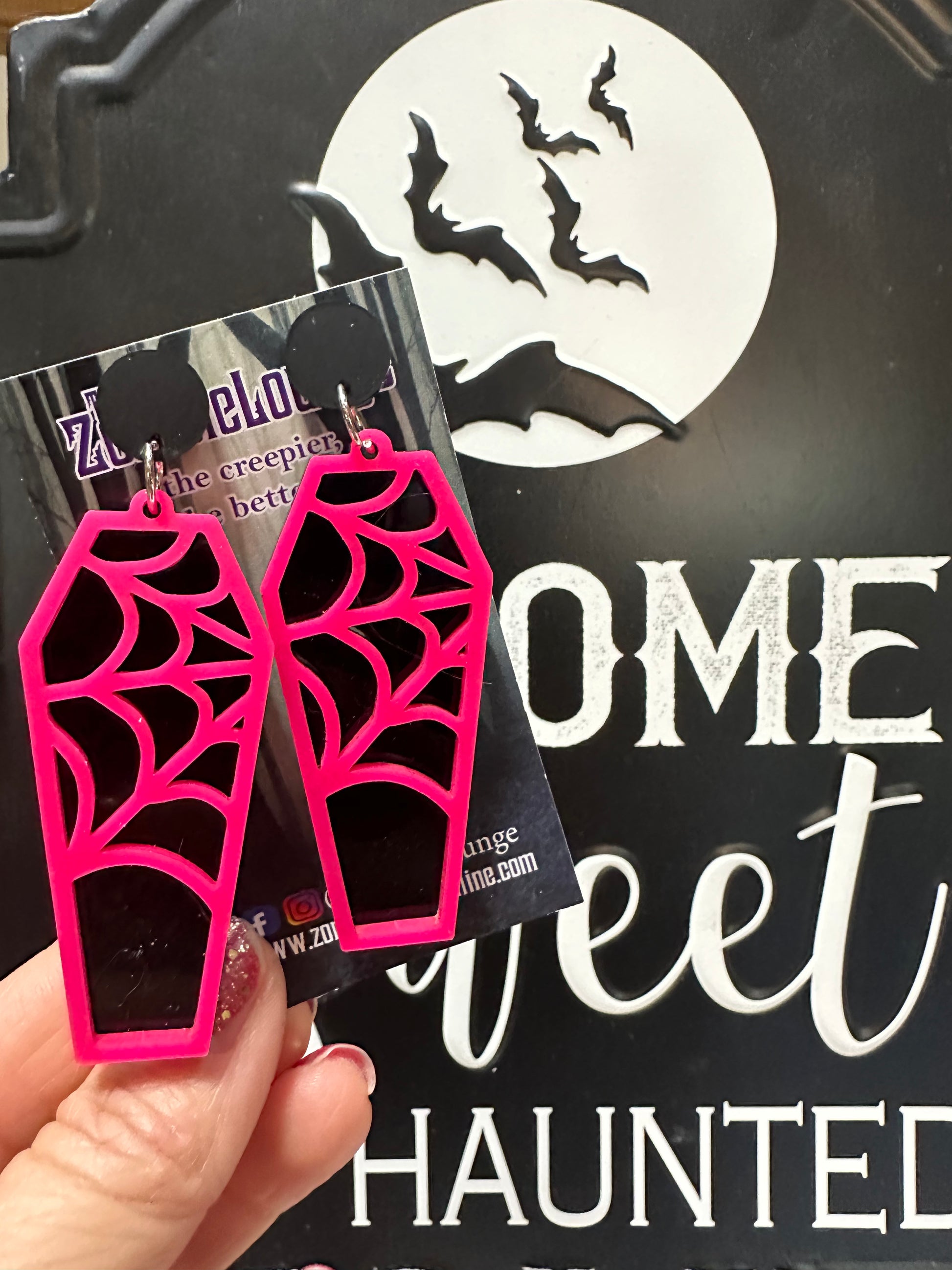 coffin acrylic earrings. Choose from orange, lavender, hot pink, or red styles! Perfect for Valloween!!